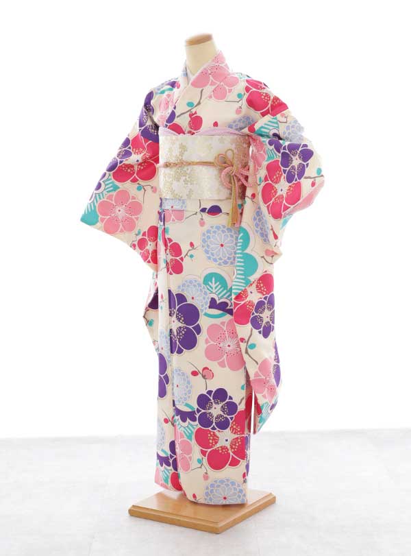 薄いクリーム色の八重梅と松や菊が描かれた着物です。シンプルな文様と印象的な色づかいが魅力的な1着です。縁起の良い柄が描かれ気品のある女性の美しさと可愛らしさを引き立てる豪華なデザインです。 レトロアンティークな柄と派手すぎない金彩使いが可憐さを引き立てます。赤地に大きな桜文の帯が華やかさをプラスしてくれます。
