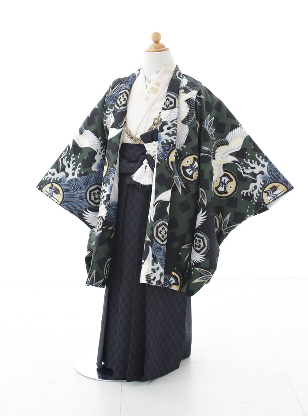 落ち着いた黒と深い緑を基調とした色合いがシックな着物です。鶴は長寿や幸福の象徴であり、波は力強さと無限の可能性を表しています。格子模様がほどこされて伝統的な美しさを感じさせます。袴は格子模様がほどこされてあり、シンプルながらも高級感があります。威厳と品格が感じられる男の子らしい着物です。 日本の伝統的な文化を現代的なセンスで表現している非常にカッコイイ着物です。