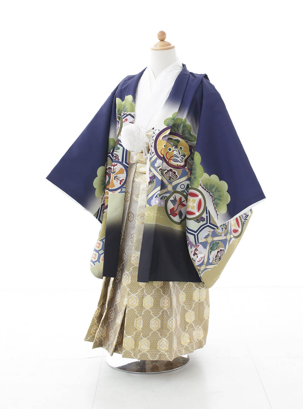 紺を基調とした地に背中には大きな兜や、松や打ち出の小槌など縁起の良い文様が美しく描かれた古典着物です。兜は男の子が強く、大成するようにと願いが込められた柄で、晴れの日にピッタリです。 袴は高級感を与えるゴールドの亀甲柄で、上品な印象を与えます。色が紺なので柄がはっきりと目立ち、男の子らしい凛々しい装いです。