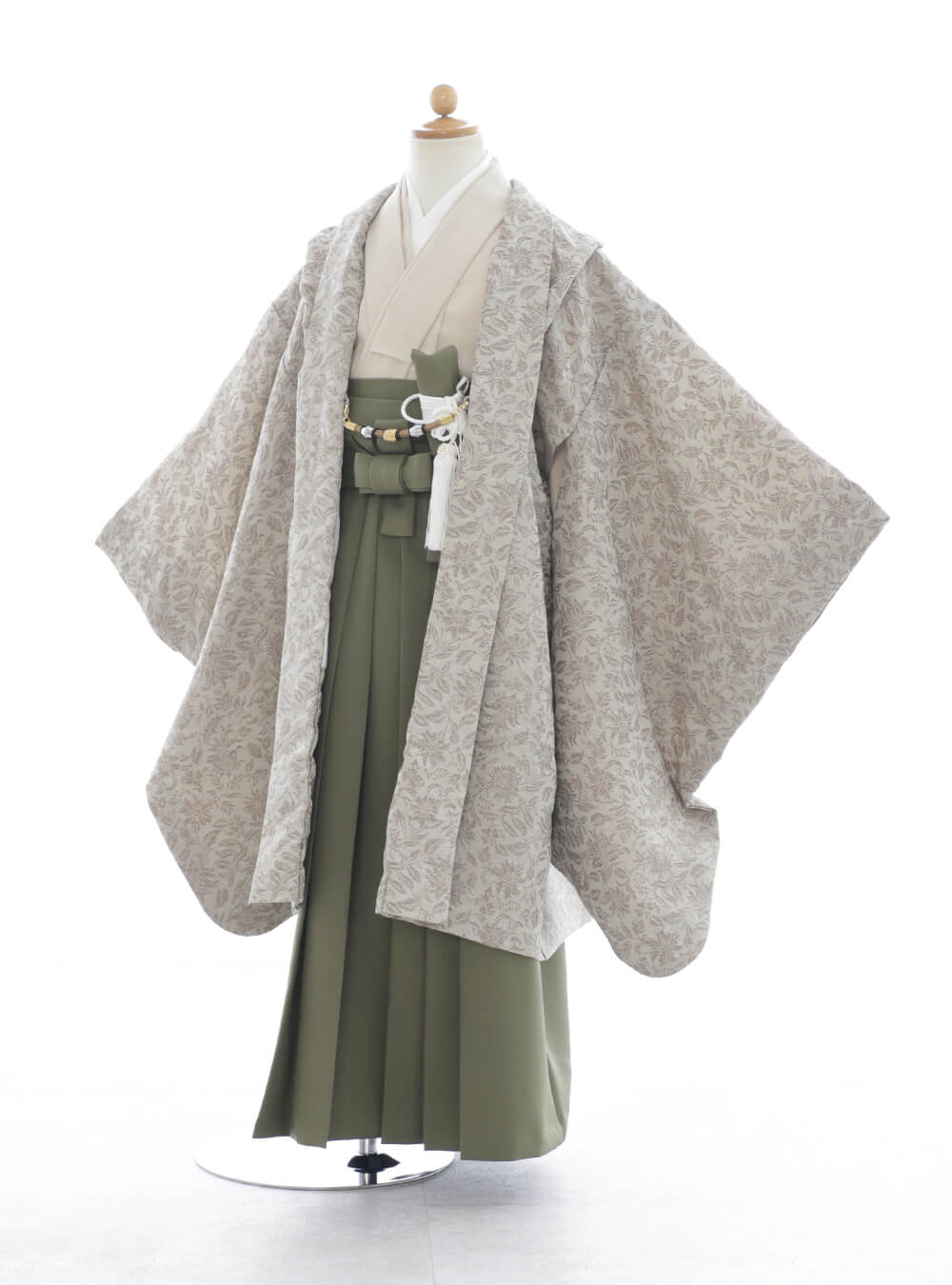 伝統とモダンが調和した洗練されたデザインが特徴です。 羽織は淡いグレーを基調に、細やかな模様が施され、上品で落ち着いた雰囲気が演出されています。袴は深みのあるカーキ色で、柔らかな印象を持ちながらも凛々しさを引き出す絶妙なカラーリング。
