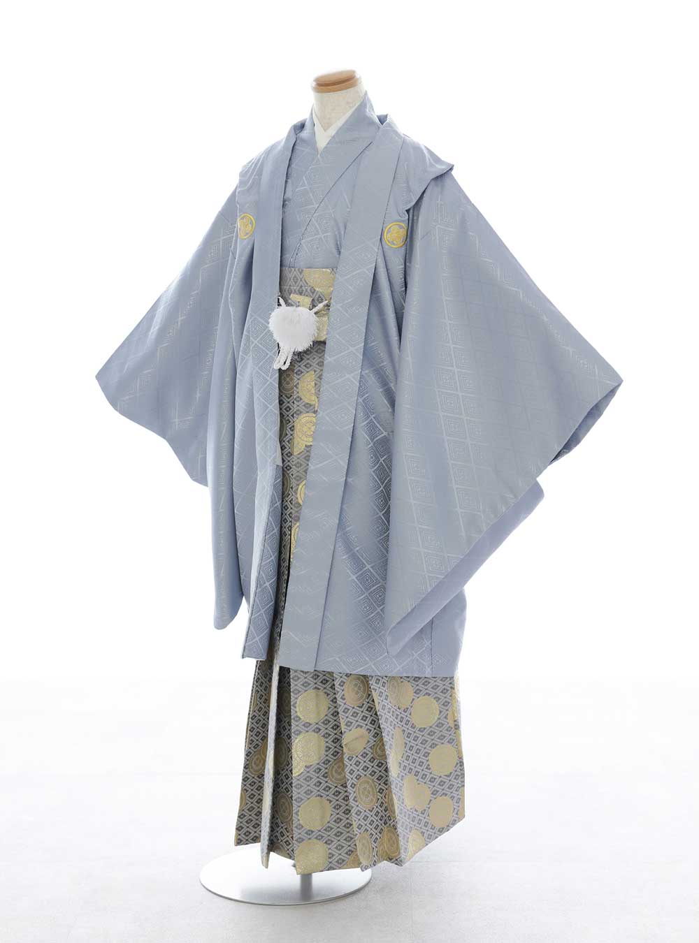 この着物は淡いブルーを基調とした優雅な男児用の袴です。羽織は繊細な模様が施された上質な生地で仕立てられており落ち着いた印象を与えてくれます。袴には大きな円形の模様が散りばめられており、伝統的でありながらもモダンなデザインが特徴です 色合いやデザインが非常に調和しており特別なシーンにふさわしい衣装になっています。