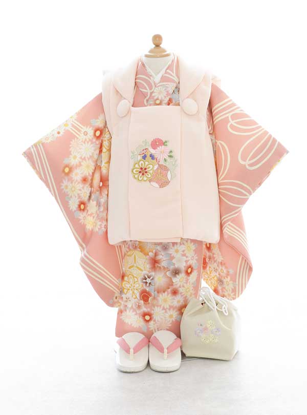 桃色が女の子らしい愛らしい印象を与え、優しく幸せな気持ちになる着物です。淡いピンクの被布には、花と鞠の刺繡がほどこされており、お子様の可愛らしさを引き立てます。 袖や中央の裾に描かれた花々が、上品で繊細な雰囲気で、どこか甘くあどけなくまだ幼さの残るお子様のイメージにピッタリ。小柄なお子様や二歳のお子様にも着ていただけるサイズの着物です。