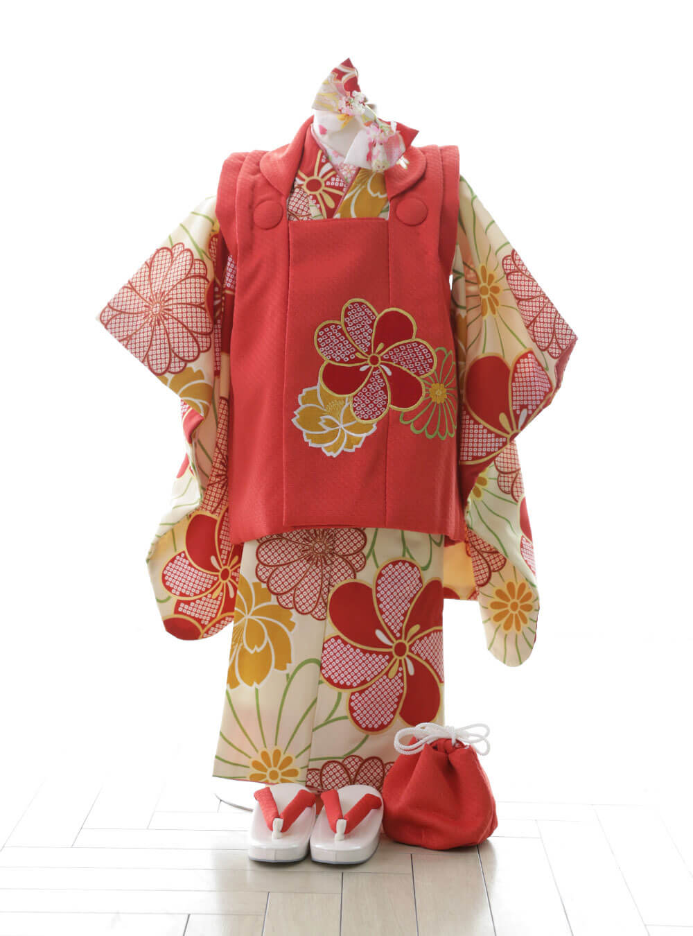 大きな花柄が全体にあしらわれており、存在感のある着物です。赤と黄色の花柄が華やかに彩られ、お子様の可愛らしさを引き立てます。色鮮やかな赤の被布がアクセントになり、写真映えするので晴れの日にピッタリ。 草履や巾着も赤でまとめられており、統一感のあるコーディネートになっています。現代的なデザインでありながらも、伝統的美が感じられる着物です。