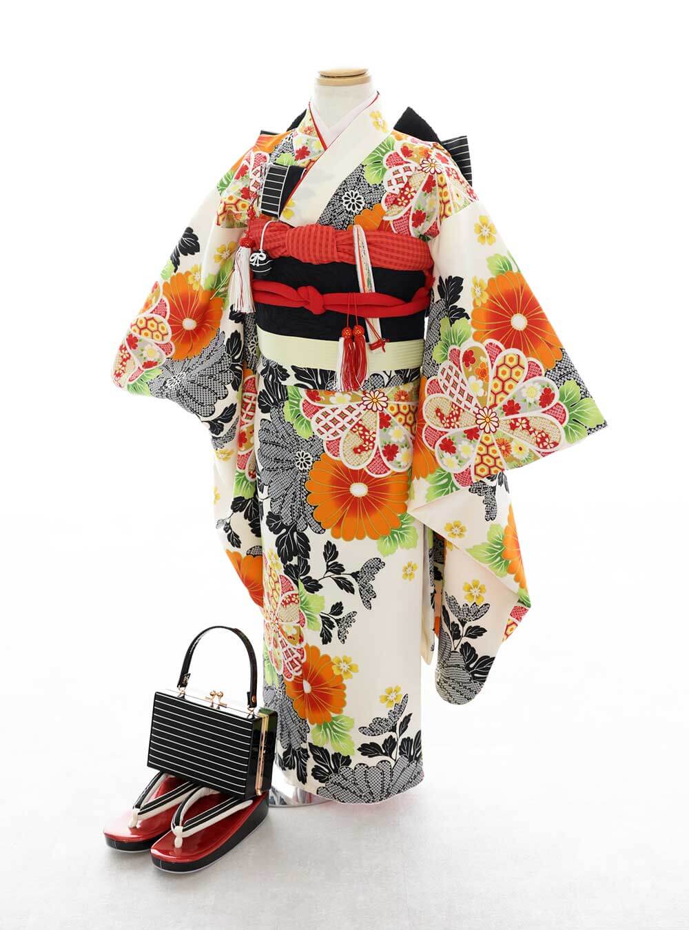 アイボリー色の地にオレンジと黒の菊が大きく描かれた、華やかで豪華な着物です。赤と黒の小物が上品さをプラスし、着物に統一感を与え、優美に彩ります。帯や筥迫、バックや草履にはストライプ柄がデザインされており、和の伝統的な装いの中にもモダンな印象を与えます。 色鮮やかで華やかなデザインが目を引き、見る人を魅了させる着物です。