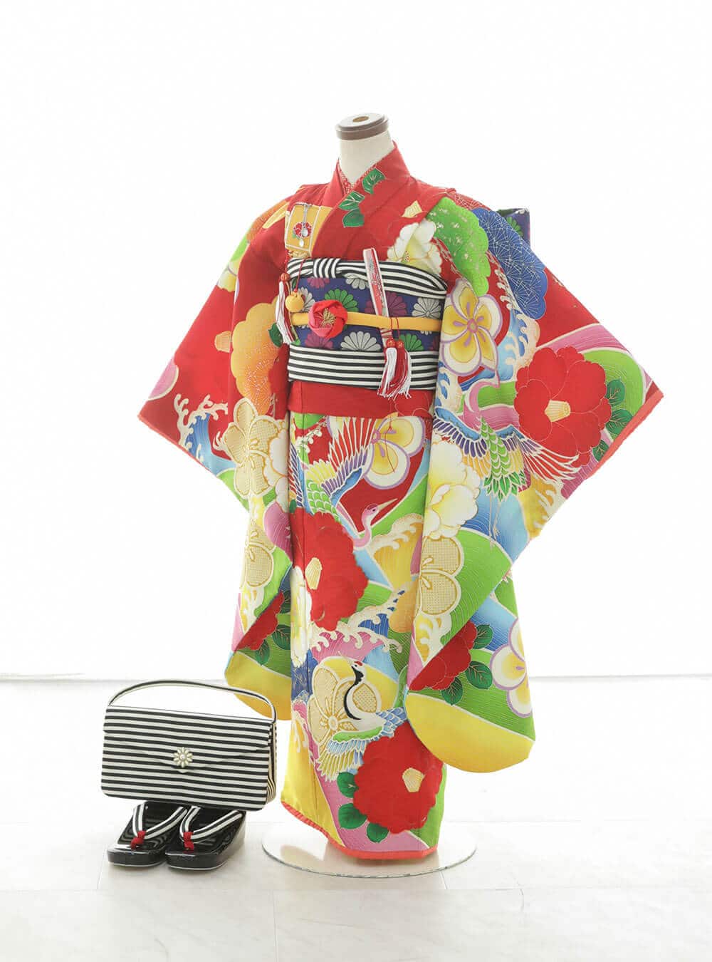 周りをぱっと明るくする大きな椿の柄がとってもオシャレなデザインです。赤の地に元気なグリーンやイエローを基調として色とりどりの花々が大きく描かれており、色鮮やかでとても華やかな着物です。差し色の白黒のストライプがアクセントになっていて、写真映えします。 古典的な雰囲気の中に、現代的なストライプ柄がオシャレです。上品で活発なイメージのお子様にピッタリの着物です。