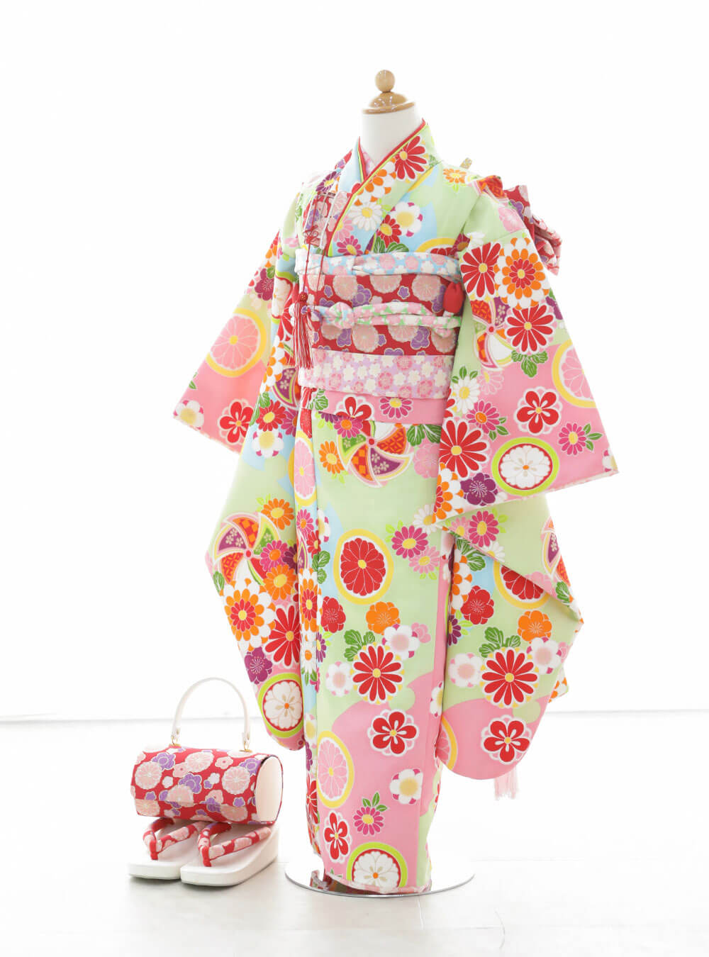 パステルグリーンの着物にピンクや赤、オレンジの色とりどりの花柄が愛らしく描かれた着物です。赤の小物や花柄がアクセントになり、女の子らしさの中にも無邪気で元気な印象を与えます。 たくさん描かれた花柄は、生命力や幸福感を象徴し、華やかさと可愛らしさをプラスしています。色鮮やかで写真映えする特別な日にピッタリの着物です。