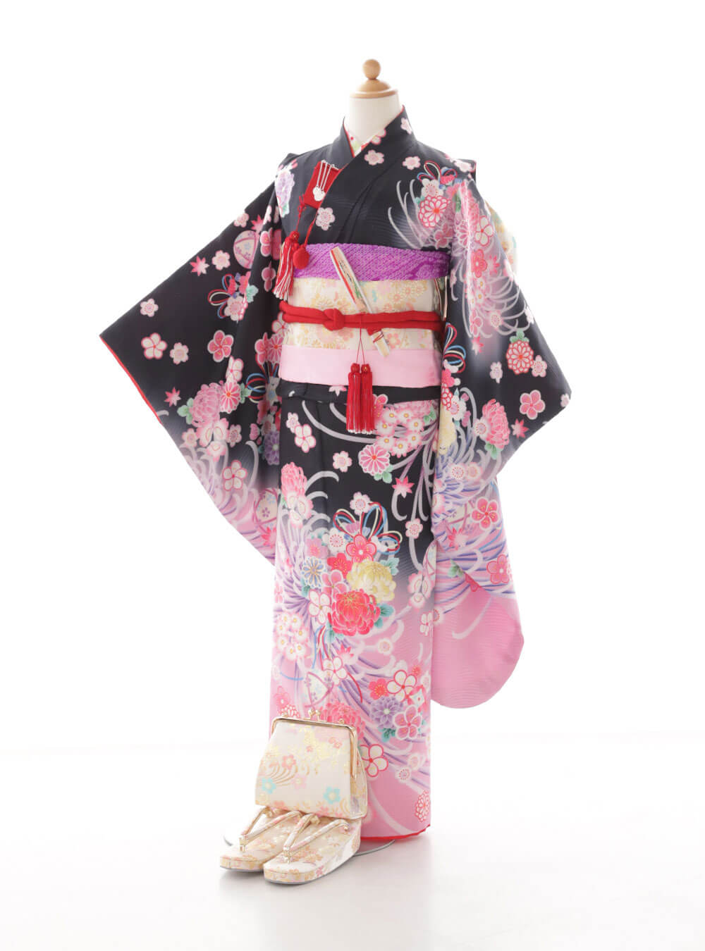 黒地をベースに、ピンクを基調とした花々が美しく描かれている華やかなデザインの着物です。金色の帯や、小物がアクセントとなり、格式あるデザインを一層際立たせています。 クールでエレガントなスタイルを求める方にぴったりの一着です。上品で伝統的なデザインは、七五三の記念の日にふさわしい格式高くも華やかな着物となっております。