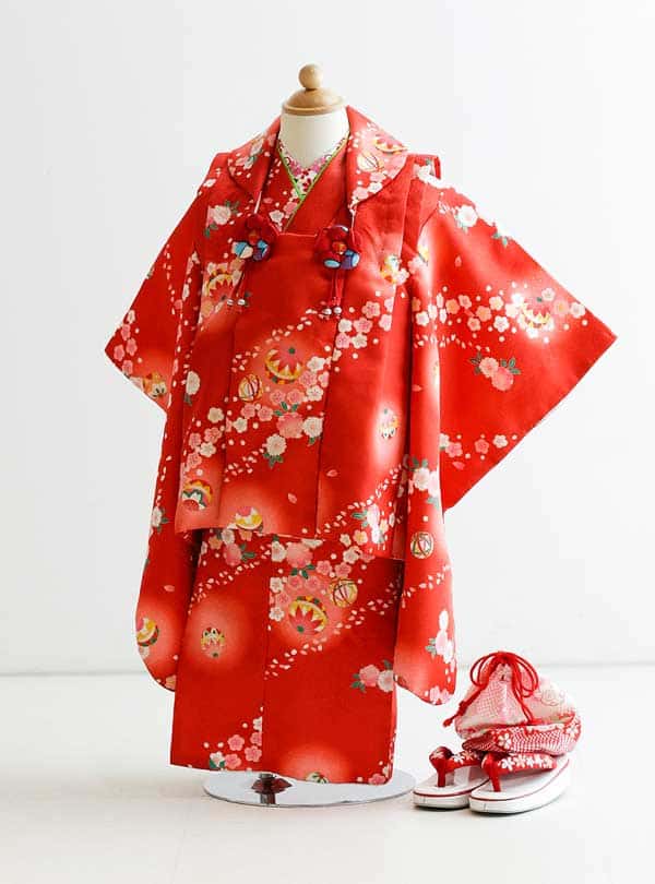 鮮やかな赤色が特徴の華やかで愛らしい一枚です。情熱的な赤は幸福や繁栄を象徴し、力強い印象を与えます。全体には可憐で美しい花々がデザインされており、お子様の可愛らしさをより一層引き立てます。 鮮やかな色合いと豊かな模様は全体を華やかに彩ります。襟元には花のモチーフが施されており、アクセントとなっています。