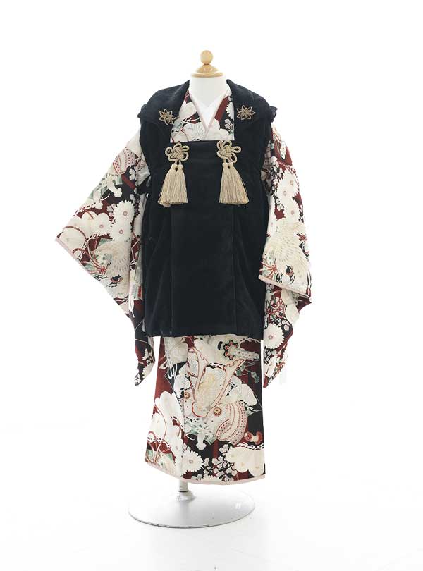 黒、白と深いえんじ色の3色でデザインされた古典柄の着物です。柄は兜や刀、鷹などの伝統柄が着物全体に施されており、深い色味で統一されているためかっこいい印象です。 被布コートは濃紺のベロア生地なので高級感があり、さらに飾り房にゴールド使用しているため古典柄ながらもトレンド感のあるモダンな雰囲気の1着です。