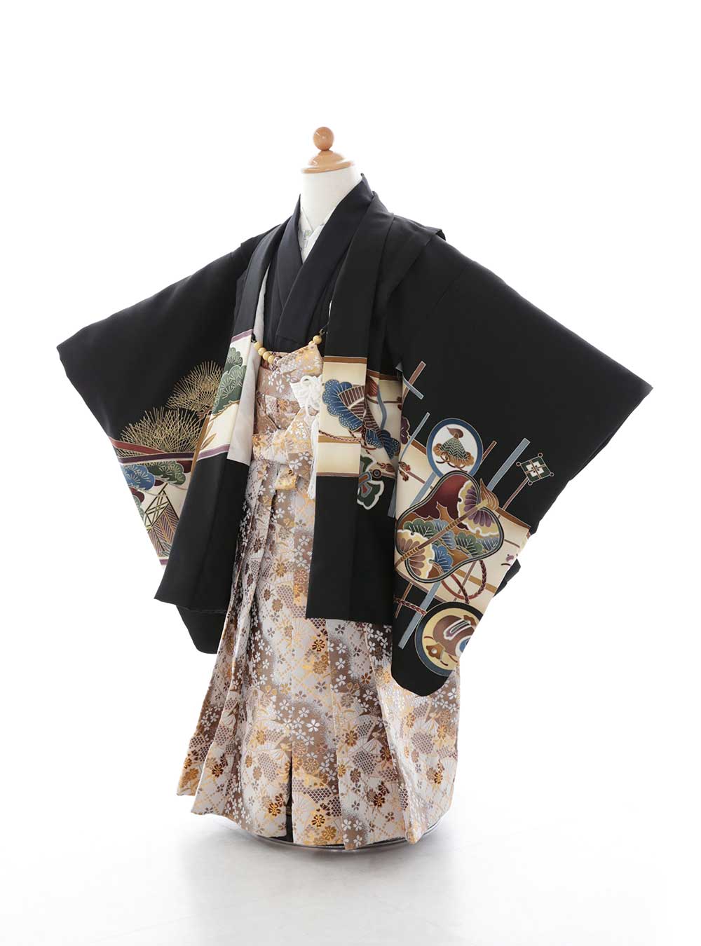 黒を基調とした羽織に宝尽くし文様が映える古典的な着物です。黒地のシンプルな着物に光沢のあるゴールドの袴を合わせた男の子らしい組み合わせ。羽織は黒を基調とし松、軍配、小槌などの伝統柄が施されたデザインです。 また背中には大きな兜と龍がデザインされており男の子らしい印象です。秋のおでかけレンタルに人気の1着。