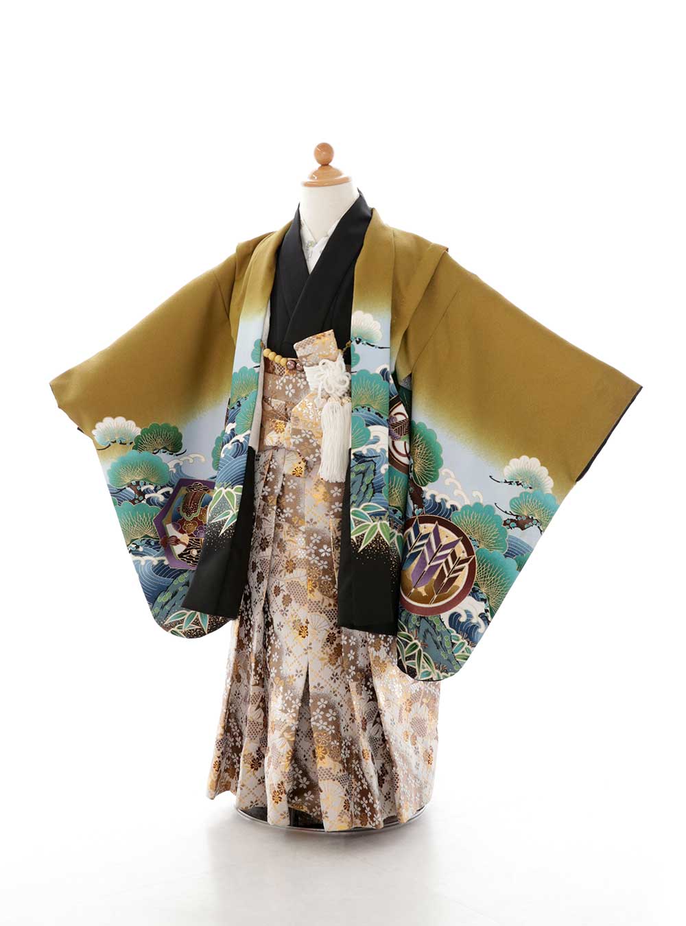 からし色の羽織が目を引く古典柄の着物です。黒地のシンプルな着物に光沢のあるゴールドの袴を合わせた男の子らしい組み合わせ。羽織は落ち着いたからし色を基調とし、松や竹、小槌、矢羽などの伝統柄が施されています。 背中には大きな鷹が描かれておりとてもかっこよく男の子らしいデザインが好きな方におすすめです。撮影はもちろん秋のおでかけレンタルにも人気の1着です。