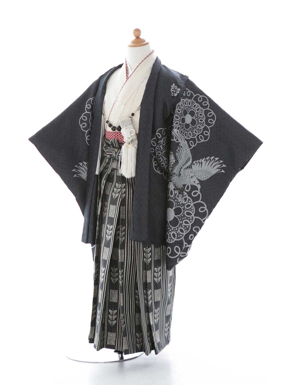 グレーとシルバーの組み合わせがシックな雰囲気の1着です。シンプルなデザインの白地の着物に重ね襟と帯の赤色がポイントカラーとなりかっこいい印象です。羽織の深いグレー地にシルバーで描かれた鷹のモチーフが特徴的です。 袴もシルバーの矢羽柄が施されており、統一された配色から大人っぽい印象です。かっこいい雰囲気が好きな方におすすめです。