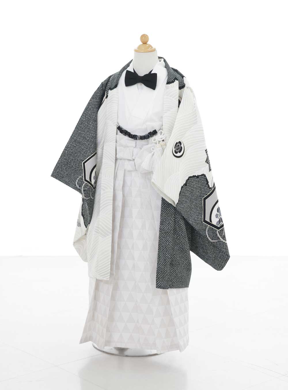 白を基調とした着物に黒の羽織を合わせた、落ち着きのある上品な一着です。背中には大きく羽ばたく鷹の柄が描かれており、力強さと凛としたかっこよさを感じさせるデザインが魅力。モノトーンでまとめられた色合いが洗練された印象を与え、お子さまの表情や仕草をより引き立てます。