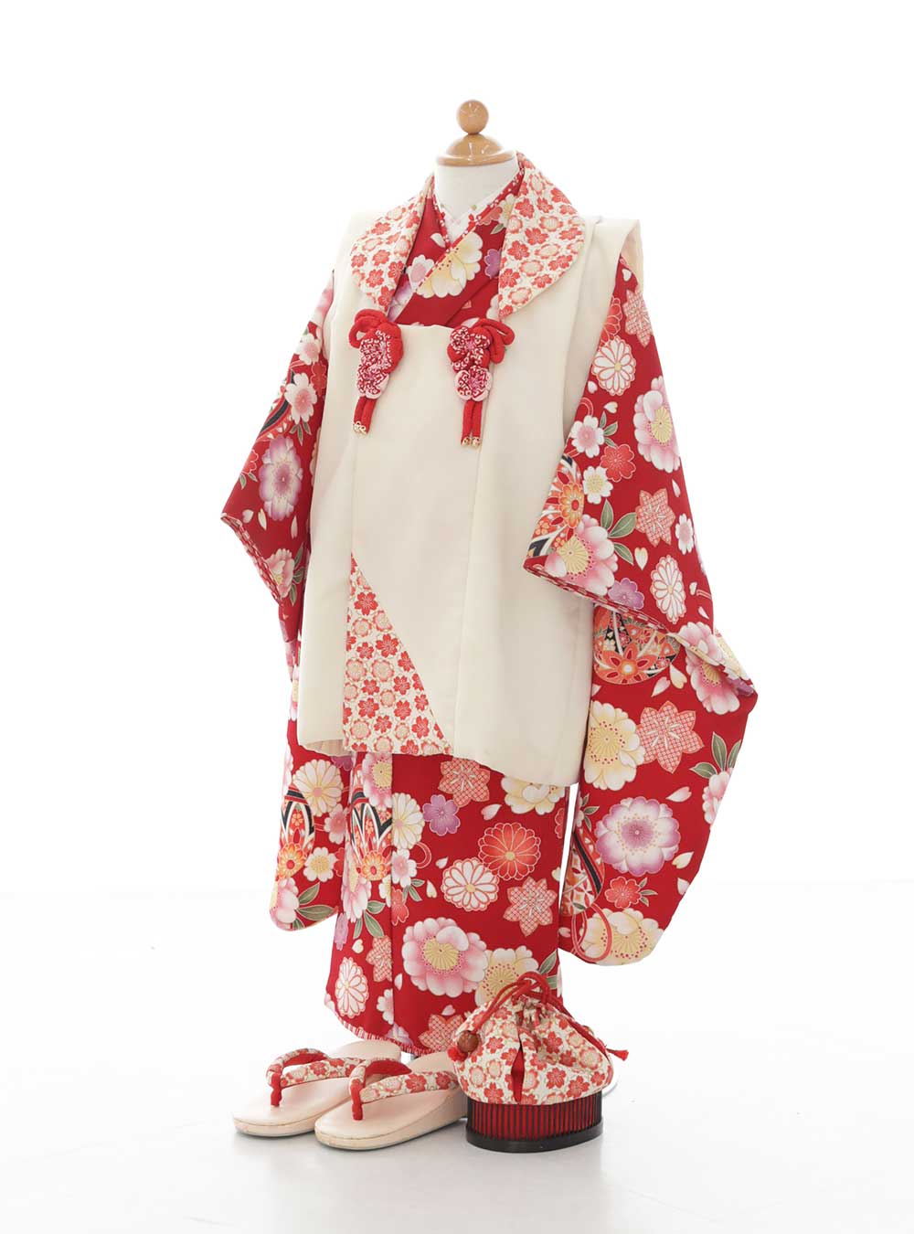 王道の鮮やかな赤の着物です。菊、桜、牡丹、毬の柄が着物全体にあしらわれており、さらに淡いピンクやイエローと多彩に描かれているためとても華やかな印象です。 襟元や裾部分や鞄に小さな桜柄が描かれているのが可愛らしくポイントになっています。とくに被布コートの襟元に施されていることで顔周りも明るく華やかな印象です。撮影はもちろん、秋のお出かけレンタルにも人気です。