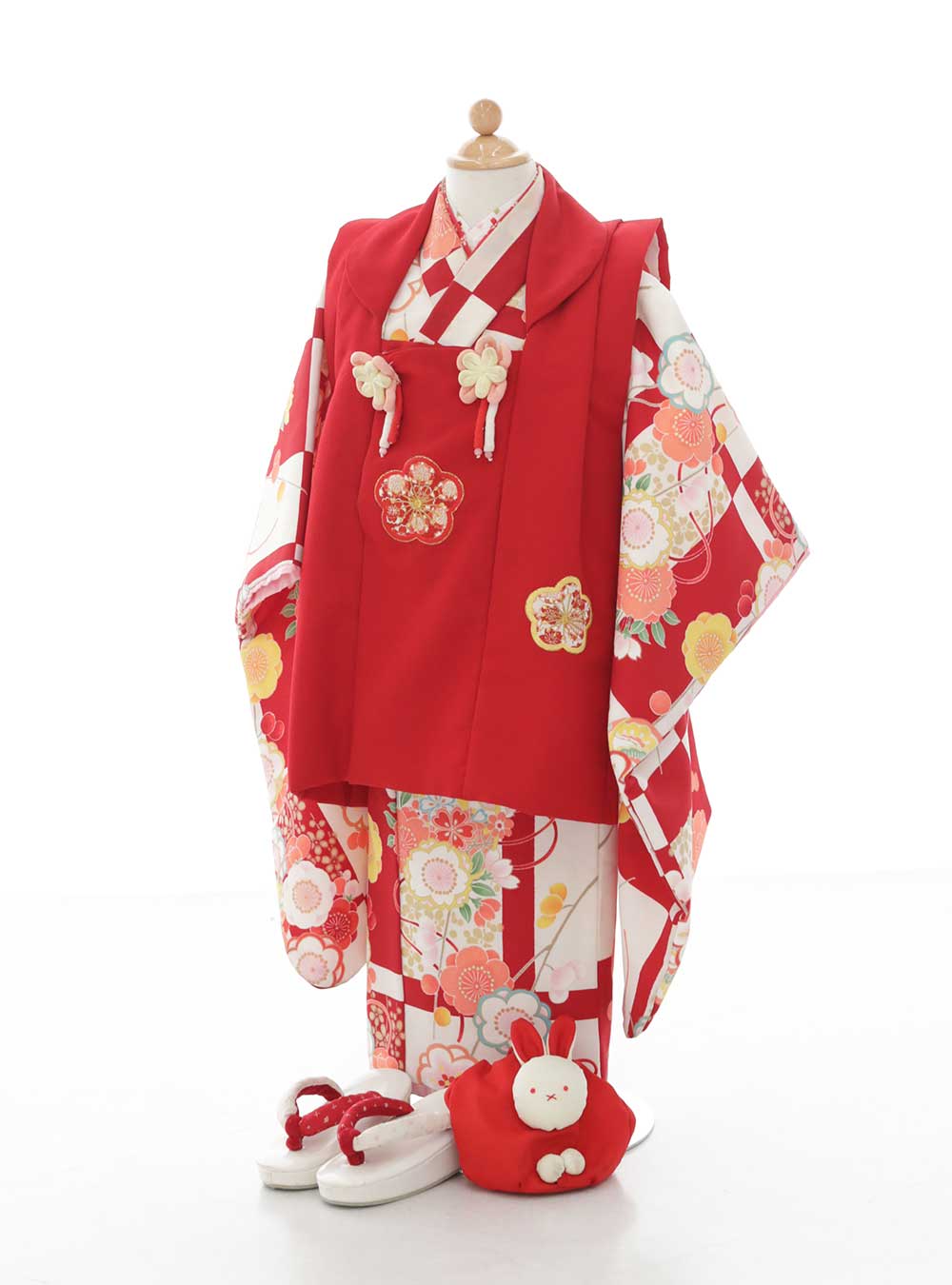 王道の鮮やかな赤と白の着物です。桜、梅の柄がとても可愛らしく華やかなデザインとなっております。被布コートは鮮やかな赤で、梅の刺繡が施されており顔周りも明るく華やかな印象です。 さらに着物の市松模様も特徴的でそのレトロなデザインが人気のポイントの一つです。また、うさぎのモチーフの鞄はとても可愛くお子様に人気です。撮影はもちろん、秋のお出かけレンタルにも人気です。