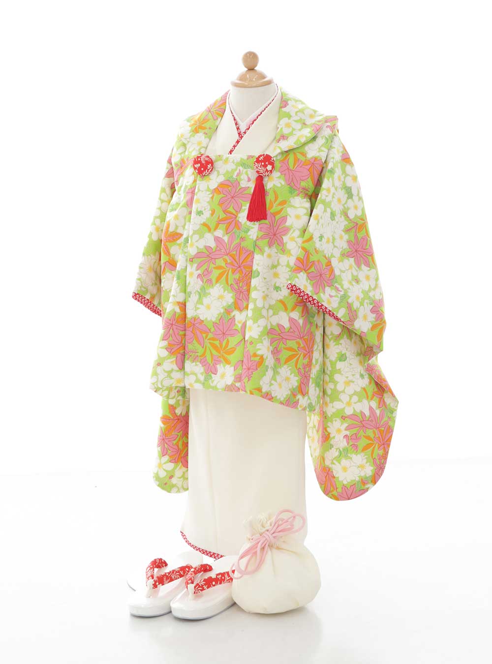 鮮やかな黄緑の被布コートが目を引く華やかな1着です。老舗和紙舗の榛原の千代紙文様のもみじ柄をそのまま着物に使用した被布コートでひと味違ったデザインです。着物は白の無地でシンプルなため被布コートの柄が引き立ちます。 胸元と袖や裾の赤もポイントになっており上品で華やかな印象。撮影はもちろん、秋のおでかけレンタルでも人気の着物です。