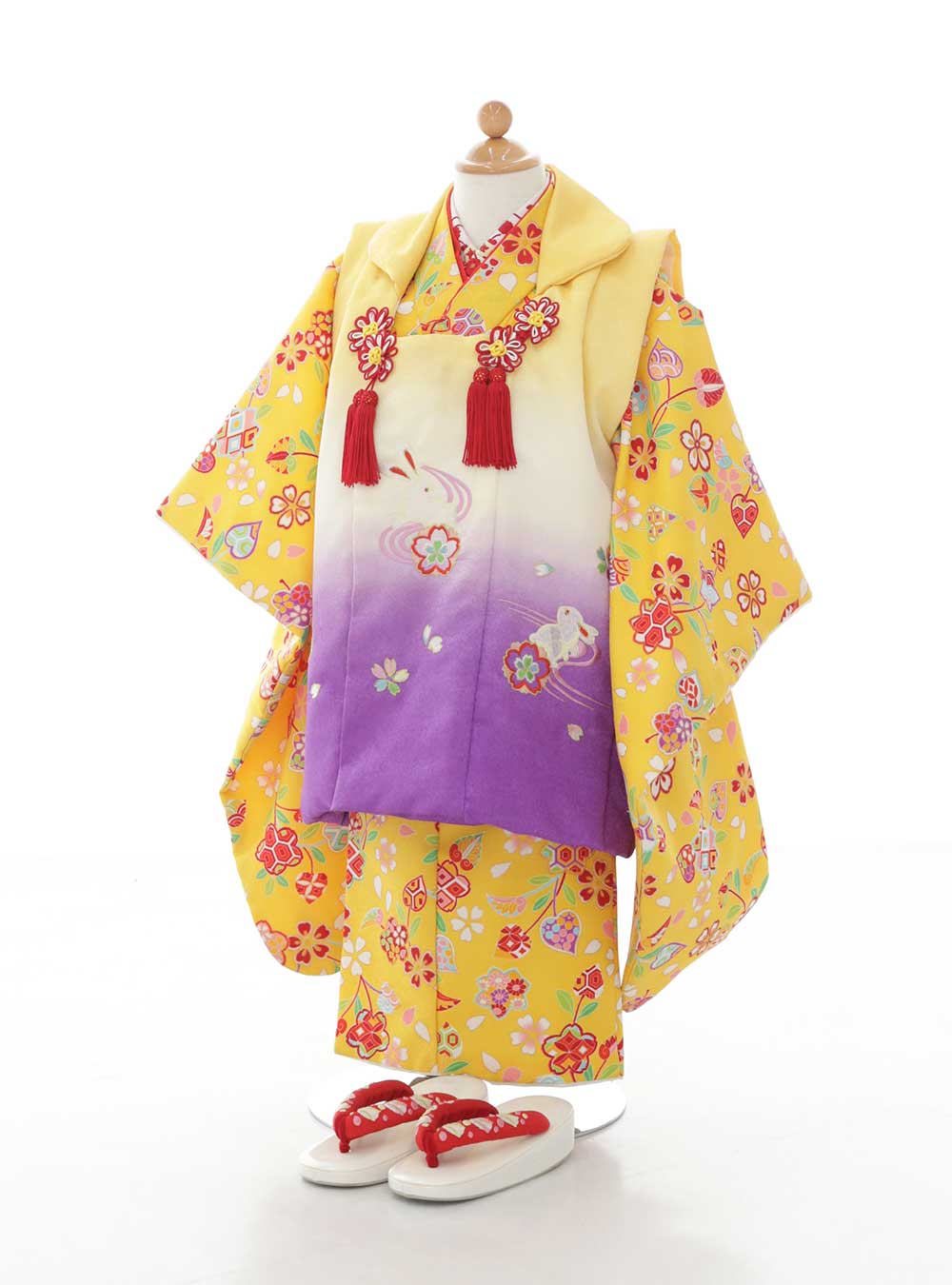 鮮やかなイエローが目を引く華やかな1着です。赤、ピンク、紫、緑と実に色とりどりの柄が着物全体に施されており、その中には桜柄やハート型もありモダンな印象を与えます。 また、イエローとパープルのグラデーションカラーの被布コートにはうさぎと流水文様がデザインされています。伝統柄とモダン柄がバランスよく組み合わされたおすすめの1着です。
