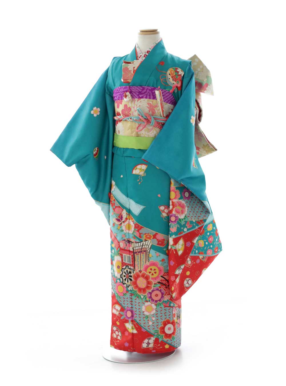 ターコイズの色味が目を引く古典柄の着物です。ターコイズの色味は数少なくモダンでかっこいい印象です。柄には鞠や御所車、扇子などの伝統柄が用いられとても華やかです。 裾部分には熨斗柄が施され、その赤色がとても映えるため一際目を引きます。個性的な雰囲気が好きな方におすすめです。