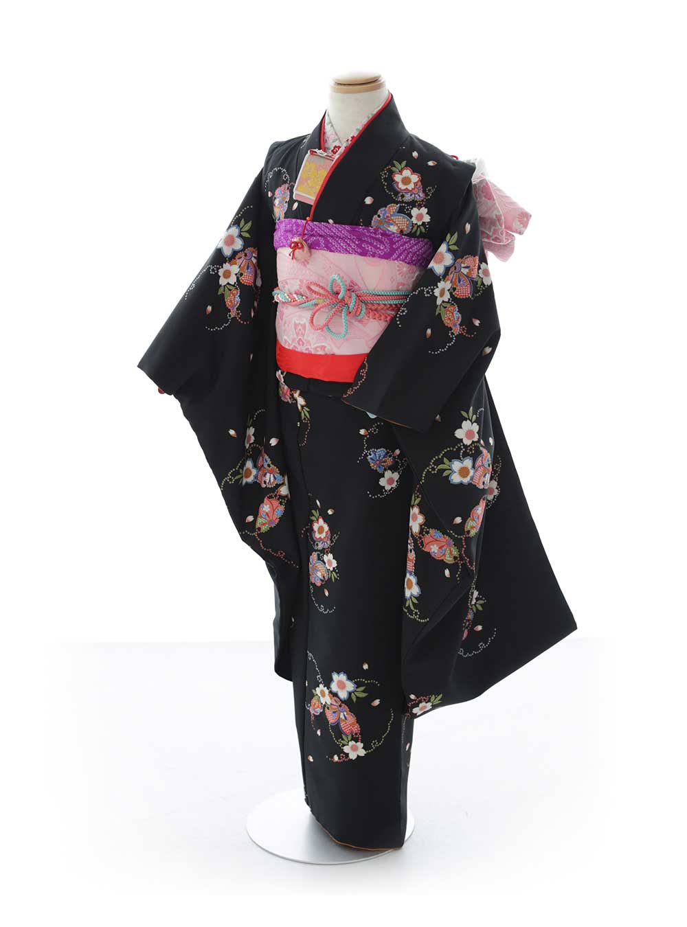 黒地がシックな印象の古典柄の着物です。黒を基調としており柄も少なくシンプルです。全体的にかっこよくクールな印象ですが小さなお花や花びらが可愛らしく色味もピンクや赤が使われているので女の子らしさも感じられます。 落ち着いた上品な雰囲気が好きな方におすすめ。