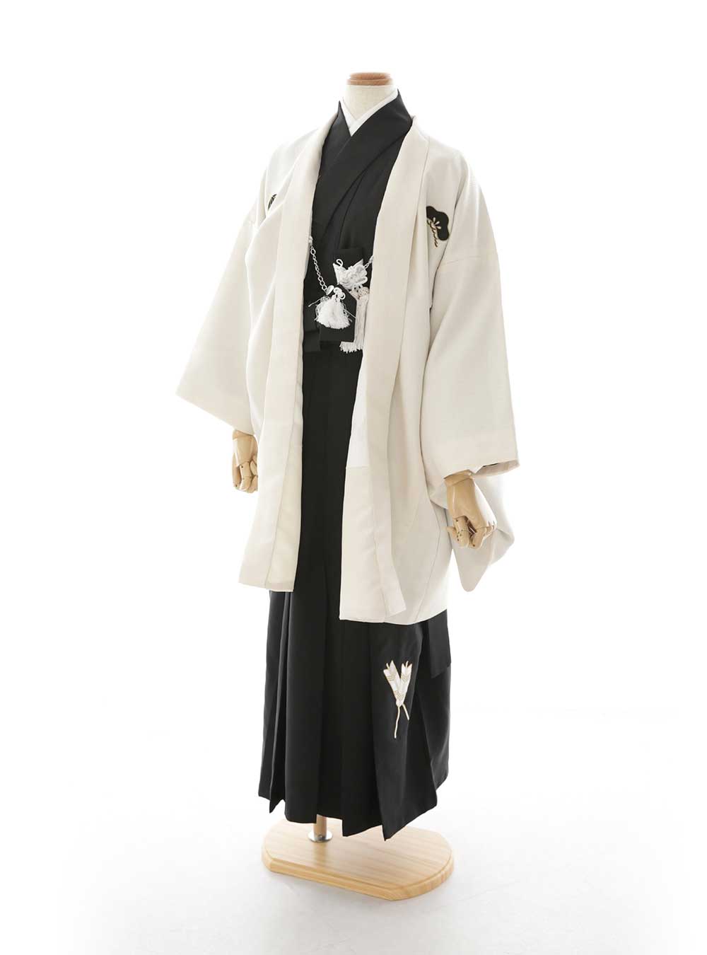 白と黒のコントラストがシックな印象の羽織袴のセットです。白い羽織が清潔感と上品さを演出し、黒の着物と袴が全体を引き締める印象を与えます。 シルバーのチェーンと白い房飾りがアクセントとなり、格式高い場面にふさわしい華やかさを加えています。晴れの日にぴったりの1着です。