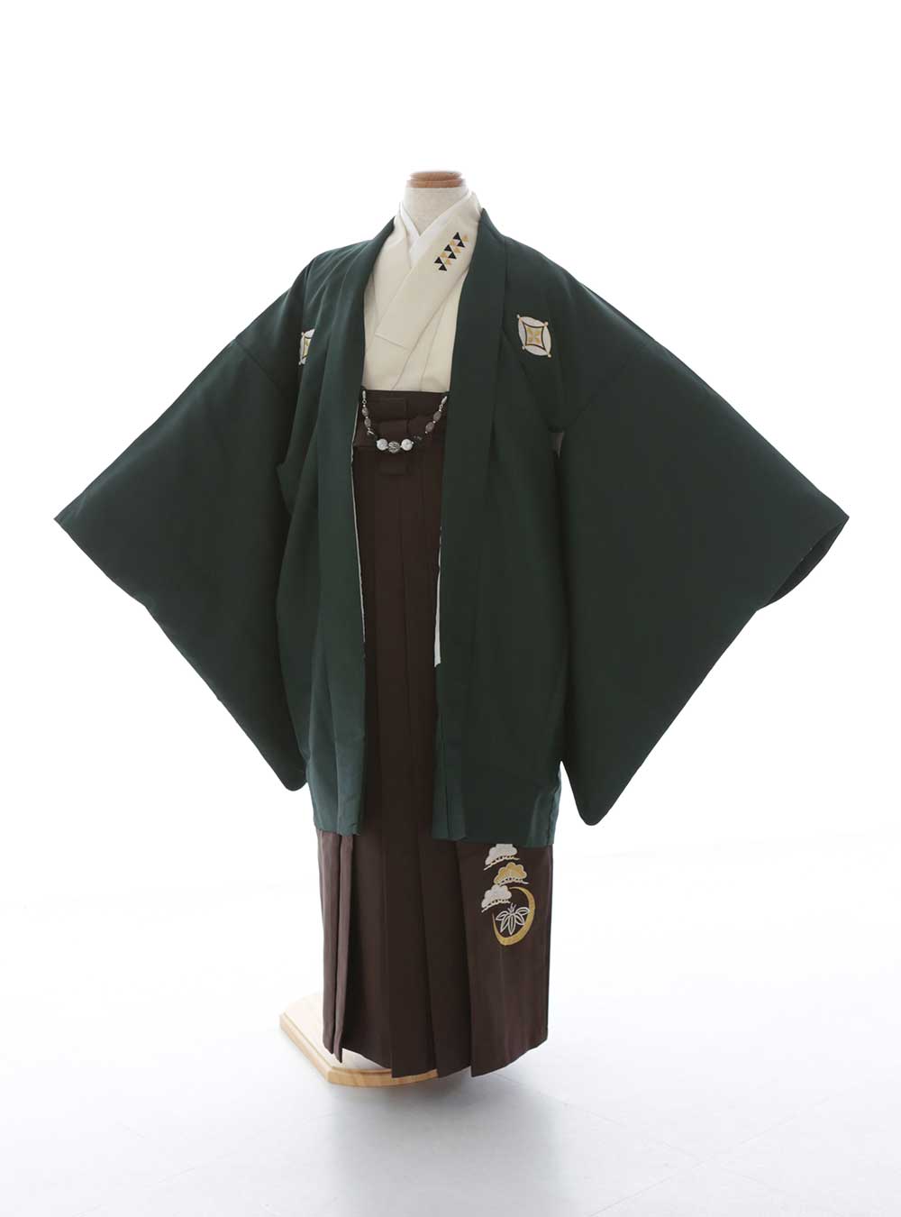 深みのある緑色の羽織が特徴で、若々しさと落ち着きを兼ね備えた一着です。シックな茶色の袴と組み合わせることで、全体に上品で伝統的な雰囲気です。肩や胸元の家紋がアクセントとなり、特別な日を彩る華やかな装いを演出します。 格式あるスタイルながらも、どこか親しみやすい印象を与えるデザインです。