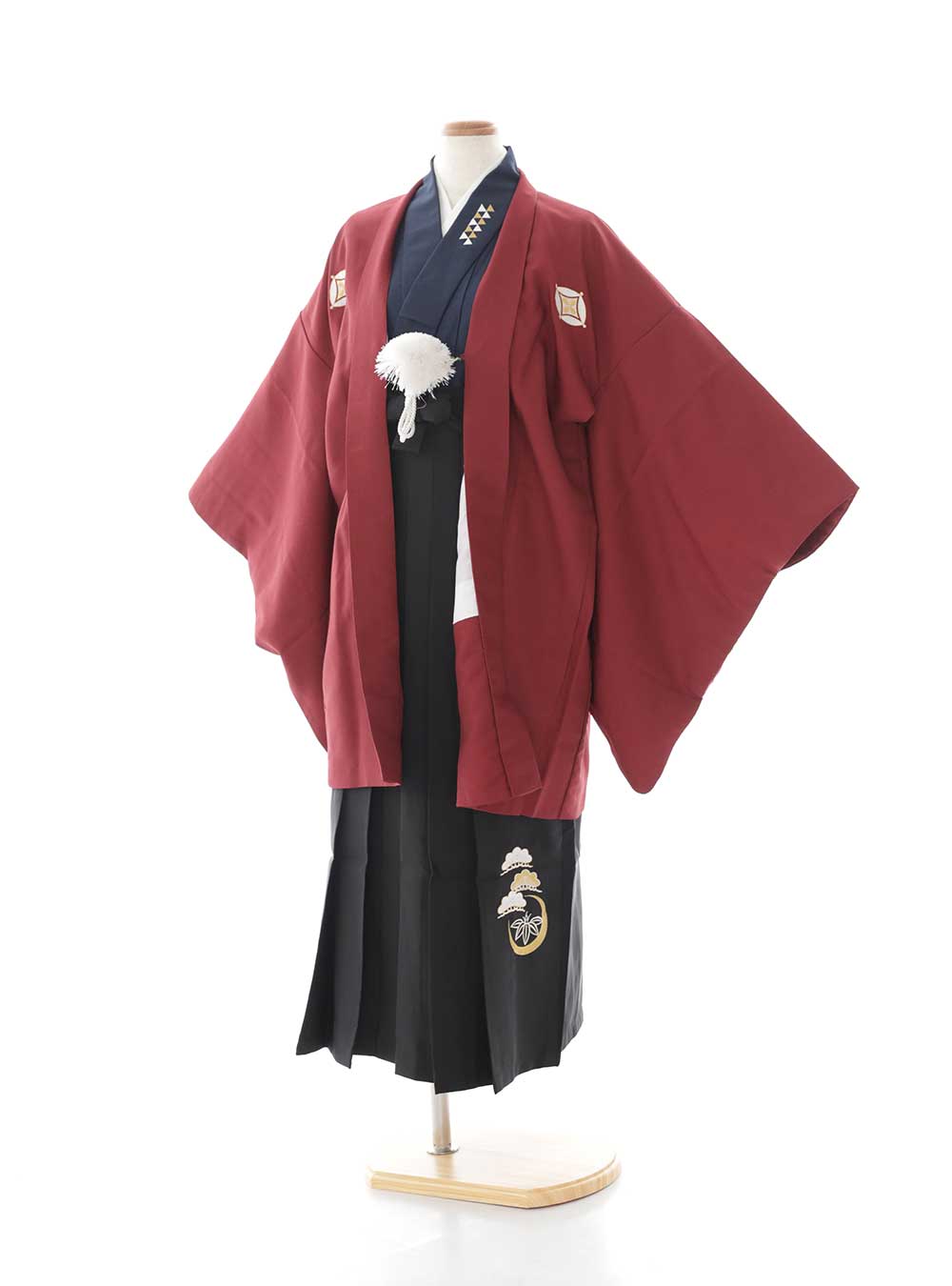 深みのある赤い羽織が特徴的な一着です。内側には紺色の着物を合わせ、落ち着いた雰囲気を演出しています。 黒い袴との組み合わせが全体に引き締まった印象を与え、家紋のデザインがさらに格式を感じさせます。特別な日にふさわしい、品格と存在感を兼ね備えた装いで、お子様の大切な一瞬を彩ります。