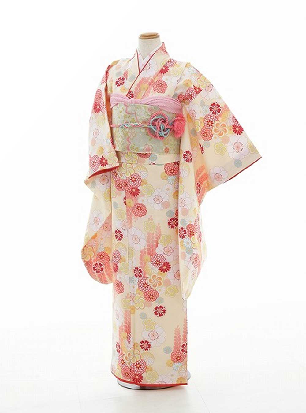 クリーム色を基調とした着物にピンクや赤のデザインが可愛らしい着物です。淡い色味のクリーム色は優しいふんわりとした印象で菊や桜、ねじり梅の小さなお花たちが着物全体に散りばめられておりとても上品な着物です。 柄の色味も赤やピンク水色など明るい色ばかりなので女の子らしい印象です。