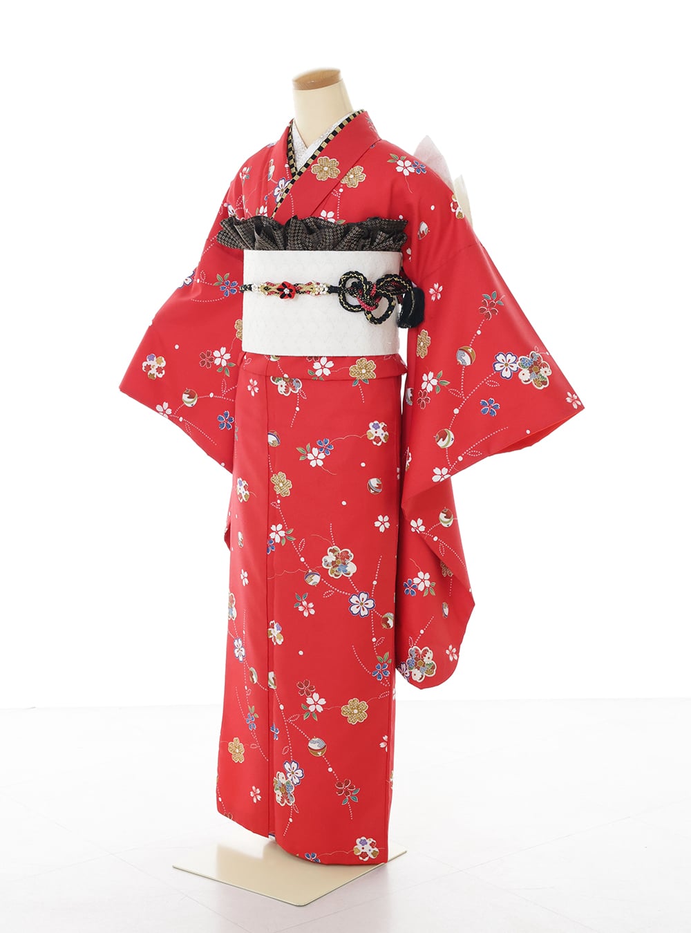 艶やかな赤色を基調とした着物に桜や手毬、金彩の流水が重なり、シンプルなデザインの着物です。 黒レースを忍ばせた白い帯がモード感を添え、鮮やかな帯締めが華やぎをプラスします。 古典柄の格調とレースの軽やかさが絶妙に溶け合い、遠目にも近くにも映えるデザインです。