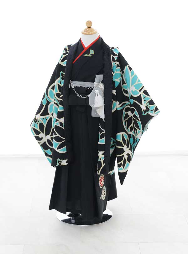 漆黒に大きな柄模様が鮮やかに描かれたひさかたロマンのブランド羽織袴。襟元の赤が男の子の力強さを表現しています。 着物の襟元と袴の裾には、豪華な刺繍が施され、高級感を漂わせます。帯と懐剣のグレーカラーが上下の同色カラーにメリハリをつけ華やかな装いにしてくれます。