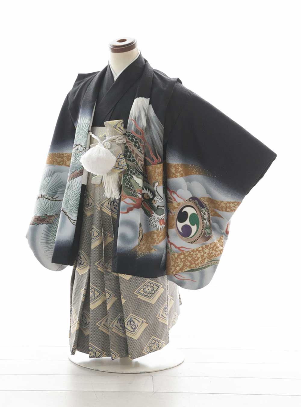 黒地に白のグラデーションが美しい羽織。大きく描かれた龍には、男の子の出世や飛躍を願う意味が込められています。 松には神が宿ると言われており、年中枯れることがなく、過酷な環境でも力強く育つことから、「長寿」「不老不死」の意味があると言われています。伝統的な古典柄が好きな方におすすめの着物です。
