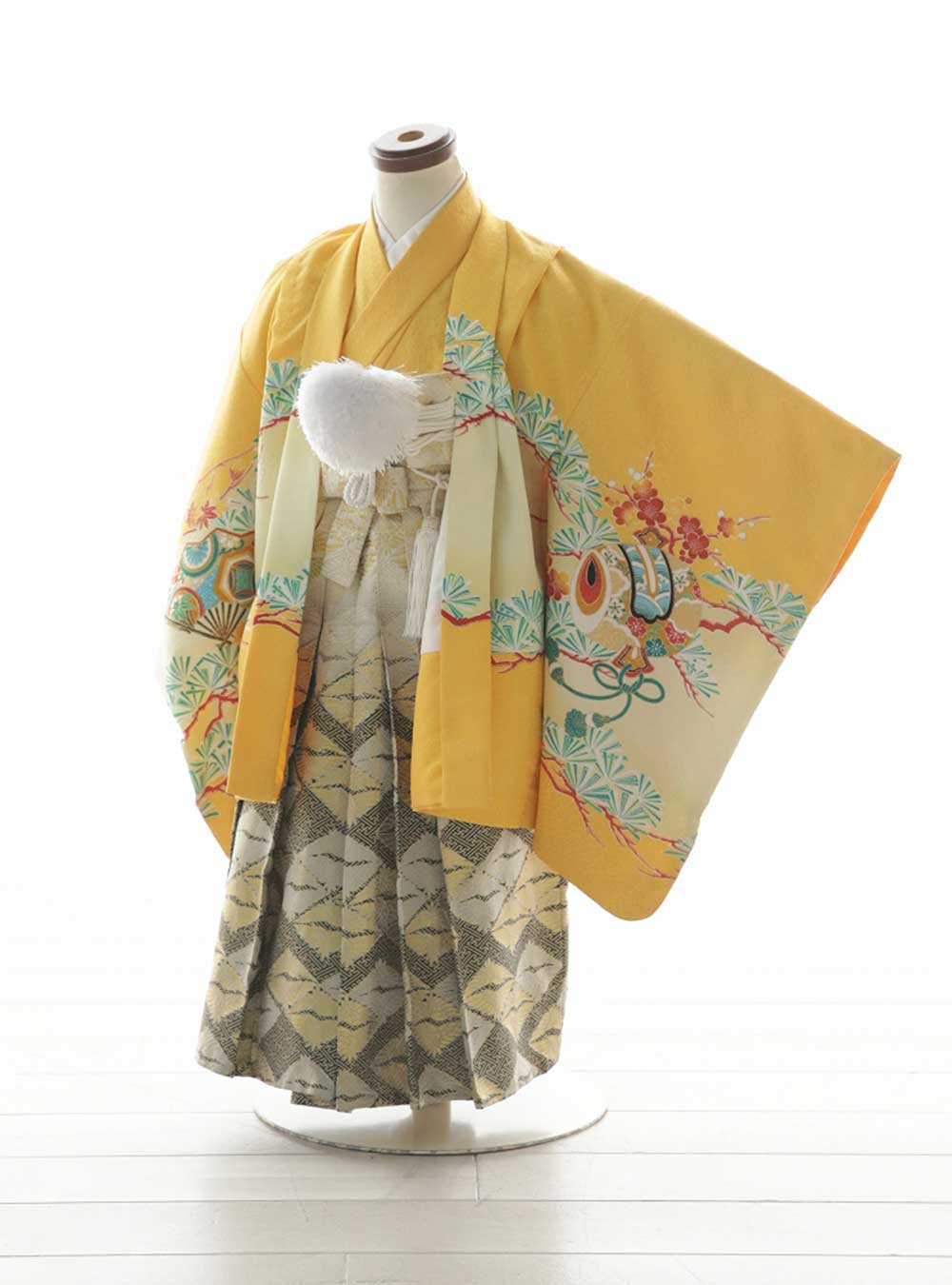 華やかな羽織の色が目を引く着物。羽織に大きく描かれた打ち出の小槌は、日本の説和や昔話に登場する宝物の一つであり、大黒天の持ち物であるともいわれ、富をもたらす象徴であると言われています。 一緒に描かれている扇子には「末が広がる」という意味が込められており、晴れの日にぴったりな、華のある羽織袴です。