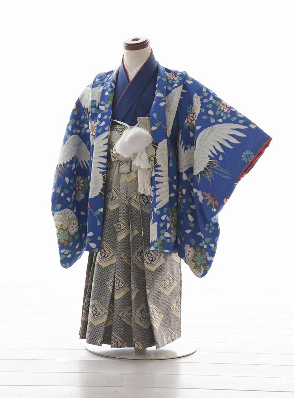 鮮やかな青地に鶴模様がよく映える着物。羽織には無数の花びらが描かれており、豪華な印象を与えます。「鶴は千年、亀は万年」という言葉があるように、鶴は「長寿」の象徴となっています。 特別な一日にふさわしい、洗練されたデザインをぜひお試しください。