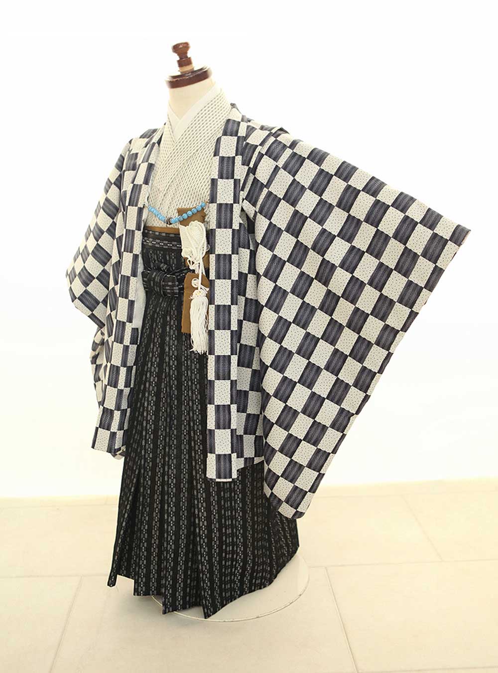 クラシックな美しさとモダンなデザインを組み合わせた一枚です。黒の羽織には日本古来の伝統的な市松模様が施されています。シンプルながらも華やかに見える市松模様は途切れることなく続いていくことから、繁栄や永遠の意味を持つ縁起のいい柄として昔から愛されています。 オーソドックスな印象を持ちながらも着物や袴にも模様が施されており、現代的な要素も持ち合わせています。