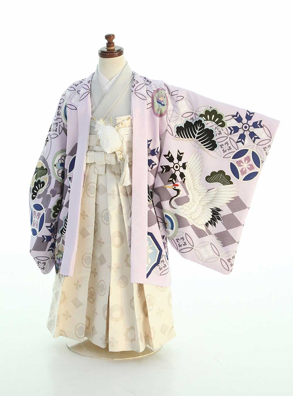 淡いトーンを基調とした着物に鶴や松、矢羽などの伝統柄が施されたかっこいいデザインの1着です。淡いベージュの着物にクリーム色のシンプルな袴を合わせ、羽織には淡い紫を用いています。 着物の色味が淡いため羽織の柄がよく目立ち、晴れの日にぴったりの着物です。撮影はもちろん秋のおでかけレンタルにも人気のデザインです。