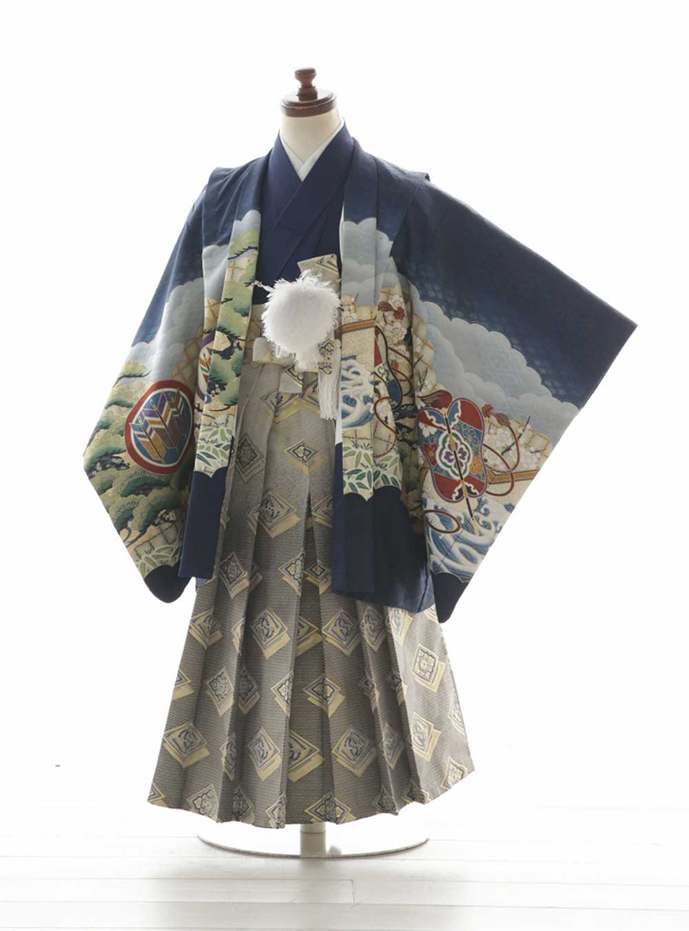 深いブルーが美しい、王道の古典柄の羽織袴。松や矢羽根といった縁起の良いモチーフがふんだんに描かれており、中でも「軍配」の柄は男の子の健やかな成長を願う意味がこめられた、代表的な絵柄です。 袴はシルバーを合わせて、凛とした印象に。格調高い、上品な一着です。