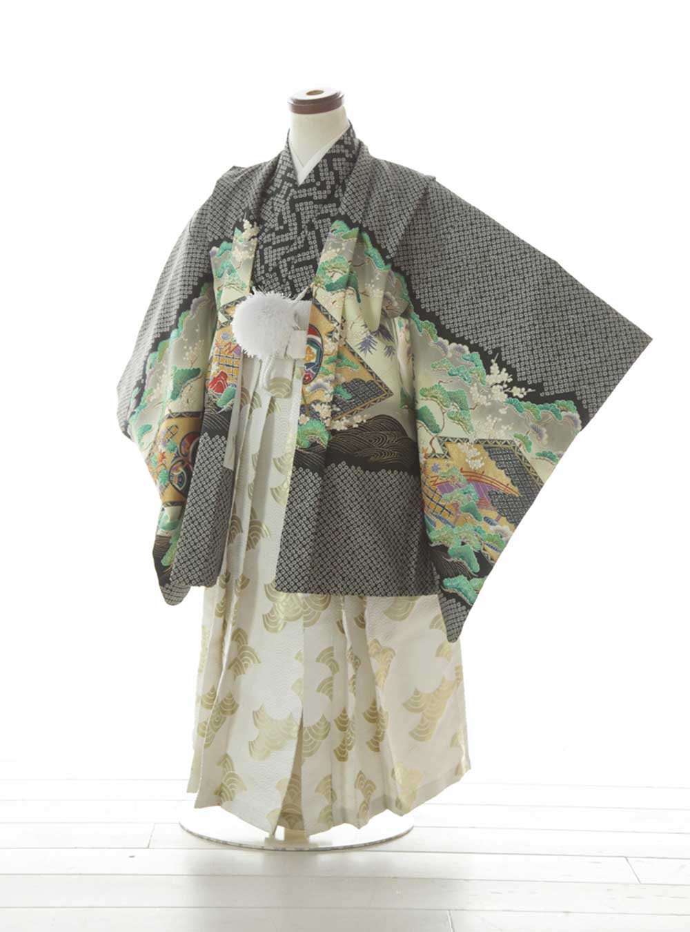 格調高い鹿の子模様の羽織には、松や梅といった絵柄が淡い色使いで描かれています。繊細な絵柄はまるで絵巻物のよう。着物は単色ではなく、羽織と同じく鹿の子模様がデザインされた、統一感を出しつつも手の込んだデザインとなっています。 羽織の絵柄部分と調和したカラーの袴には、ゴールドの扇模様。さりげないアクセントが高級感を引き立てます。