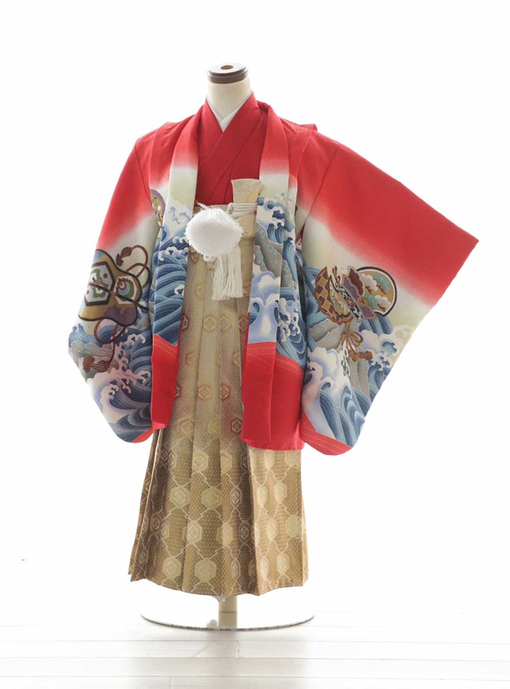 鮮やかな赤が目を引くこの羽織袴は、力強さと華やかさが融合したデザインです。羽織には波がダイナミックに描かれ、壮大な日本の自然を表現しています。ゴールドの袴との組み合わせが豪華さをさらに引き立てて、特別な日にふさわしい存在感を放ちます。 大胆で印象的なスタイルを楽しみたい方にぴったりの、格式高い一着です。
