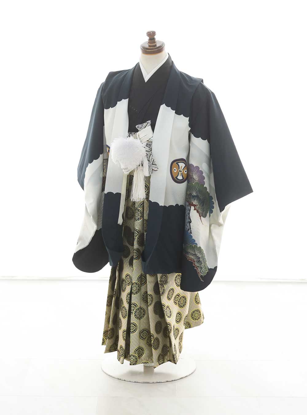 ブラックを基調としたシックな羽織に、鮮やかな模様の描かれたゴールドの袴を合わせたスタイル。羽織に描かれた松の木は、冬でも変わらず緑を保つことから、縁起の良い柄として古くから親しまれてきました。 伝統的な柄をメインとした、格式高い印象のコーディネート。凛とした美しさが際立ちます。