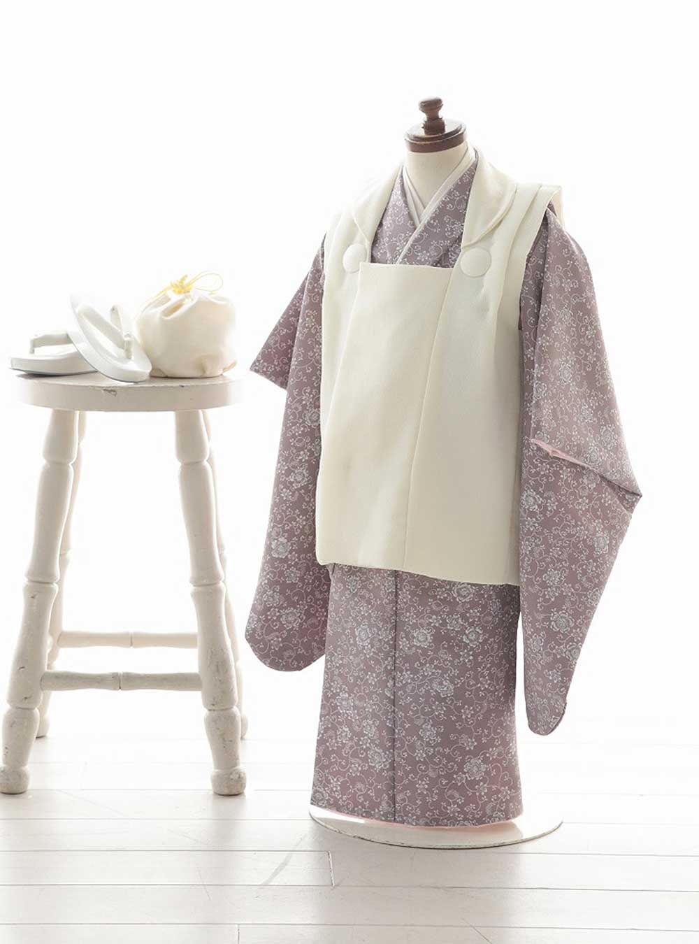 エミュオリジナルコーディネートの被布。シックな色合いの小花柄がレトロで可愛いデザインです。被布コートはシンプルな無地のデザインで着物の柄をより美しく上品な印象にします。 小物もコートに合わせたホワイトで統一感のあるコーディネートをお楽しみいただけます。