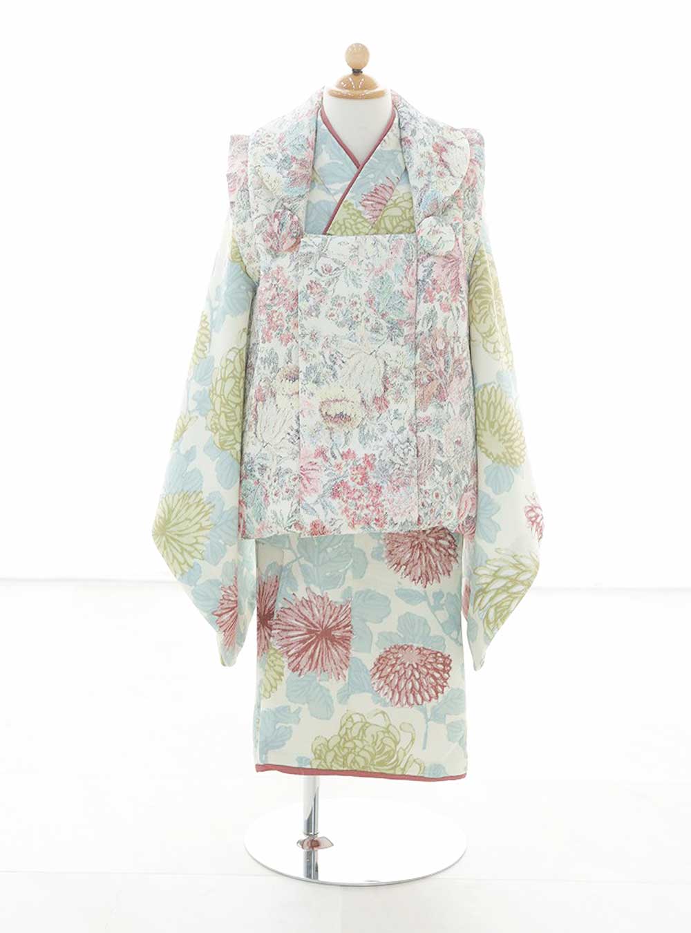 エミュオリジナルコーディネートの被布。近年流行しているくすみカラーが大人可愛いデザイン。被布コートと着物のモダンな花柄が、華やかさとエレガントさを持ち合わせたデザインです。 少し小さめのサイズ展開で2歳から着用可能です。