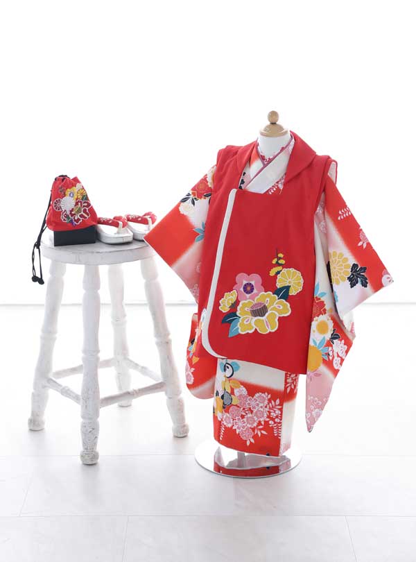 伝統的な古典に現代の要素を少し加えた「Kirara enfant」のブランドお着物。真っ赤な被布コートに椿・菊・梅の刺繍がワンポイントで施されており、豪華な仕上がり。着物は赤白のカラーリングがおめでたい特別な日の装いにぴったりです。 お子様の晴れの日を彩るにふさわしいデザインのお着物です。
