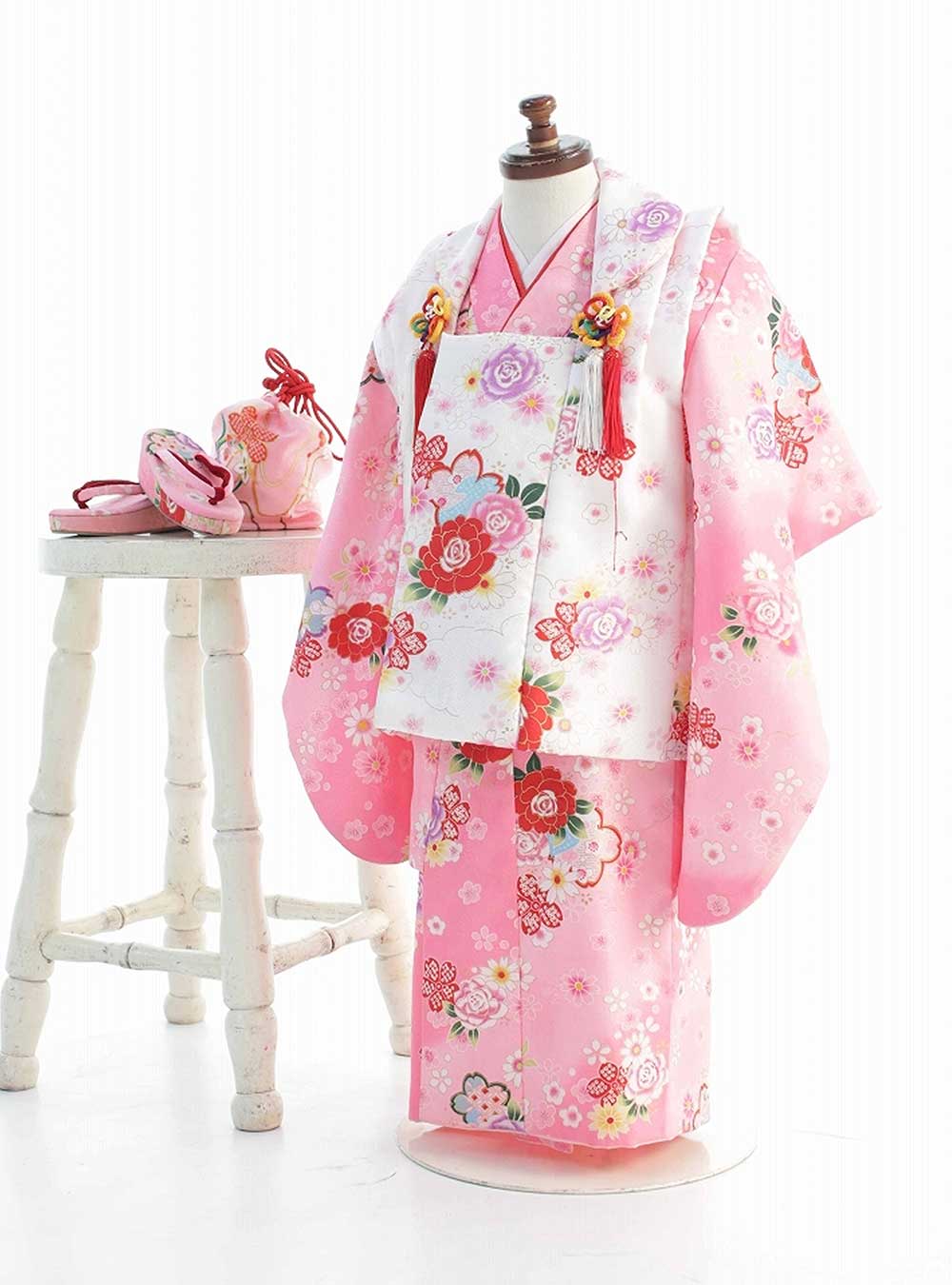 着物も被布コートも全面に様々な花模様が描かれた華やかな着物。ピンクを基調とした着物に白の被布コート、それぞれの相性が良くより可愛らしい印象に仕上がります。無数に描かれた縁起の良い花々が、お子様の晴れの日にピッタリのデザインです。 昔ながらの古典デザインで伝統的な着こなしをしたい方におすすめの着物です。少し小さめのサイズ展開で2歳から着用可能です。