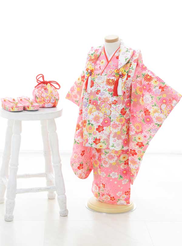 着物も被布コートも全面に様々な花模様が描かれた華やかな着物。ピンクを基調とした着物に白の被布コート、それぞれの相性が良くより可愛らしい印象に仕上がります。無数に描かれた縁起の良い花々が、お子様の晴れの日にピッタリのデザインです。 昔ながらの古典デザインで伝統的な着こなしをしたい方におすすめの着物です。