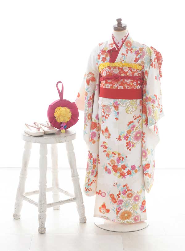 「Kirara enfant」のブランド着物。 白地の着物に色とりどりの花々が散りばめられた可愛らしい着物です。古典的な花柄に蝶や鞠の模様がアクセントになっており、より華やかな印象にしてくれます。 鞠には「豊かに成長するように」との願いが込められ、長い糸で作られることから「よい人に出会えるように」という意味が込められている着物です。