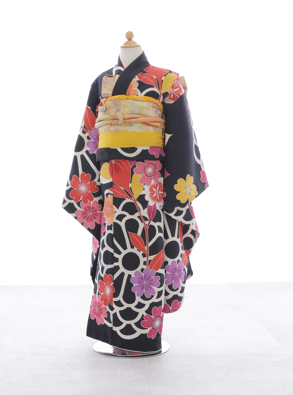 古典的な花柄をモダンにアレンジしたデザインは、華やかでありながら上品さも感じさせ、7歳ならではの大人っぽい印象になります。 着物全面に描かれた桜は「豊かさ」や「繁栄」をあらわす縁起の良い吉祥文様とされ、人気の高い柄です。黒を基調とした着物に散りばめられた花々の柄が、お子様の可愛らしさをより華やかな印象にしてくれます。
