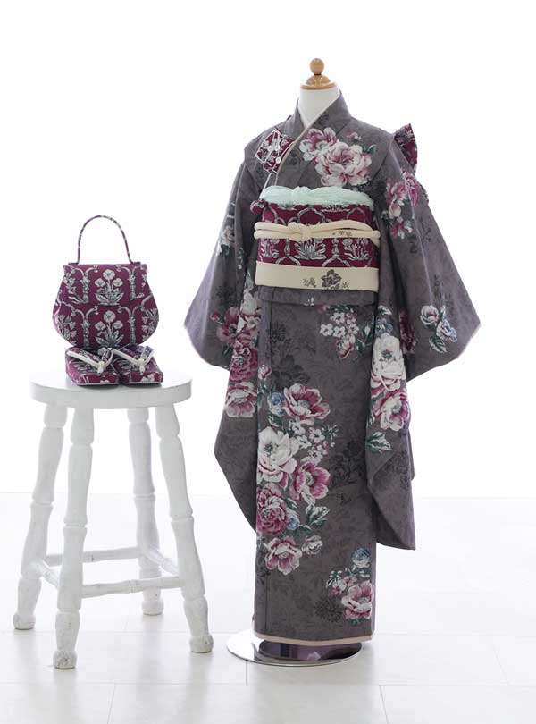 人気ブランド「JILL STUART」のブランド着物。 グレーの着物は「落ち着き」「洗練」「エレガント」「上品」などの意味を持ち、大人っぽく上品な印象を与えてくれます。グレーの地色にも花々が描かれており、白や紫、緑などの色使いがシンプルになり過ぎず統一感のあるエレガントな一着。 3歳のお被布と姉妹でブランド合わせの撮影も人気です。