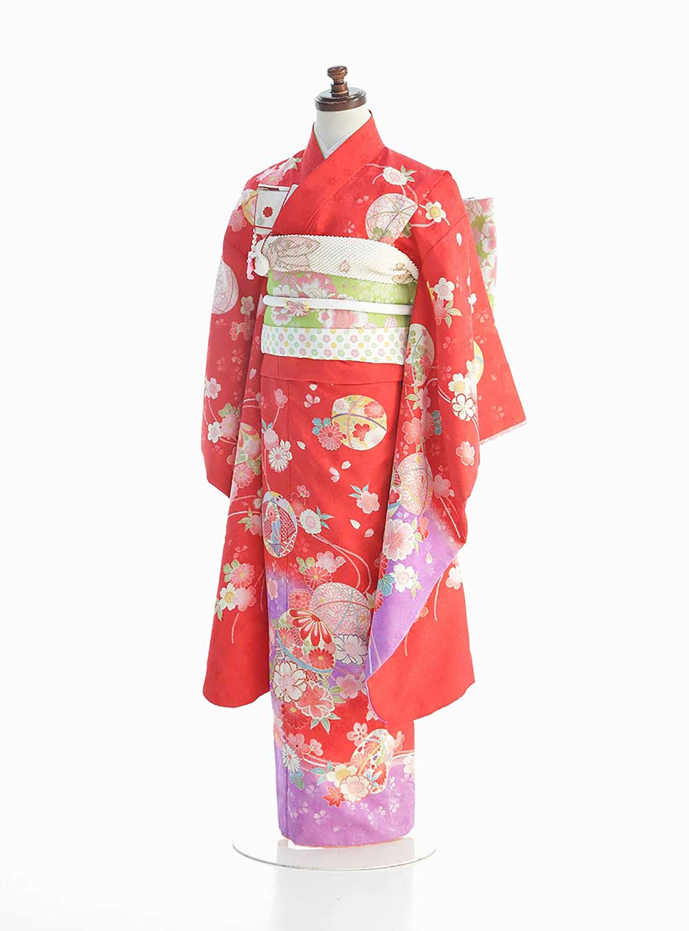 鮮やかな赤を基調とした古典着物。 全体に桜や梅、菊など縁起の良い花々が描かれ、可愛らしい印象に上品な雰囲気を演出してくれます。 梅の文様は、忍耐力や生命力の意味が込められており、扇や鞠といった伝統的な和柄がアクセントとして取り入れられ、裾にかけての紫のグラデーションが施され華やかさの中にも奥行きが感じられるようなデザインです。