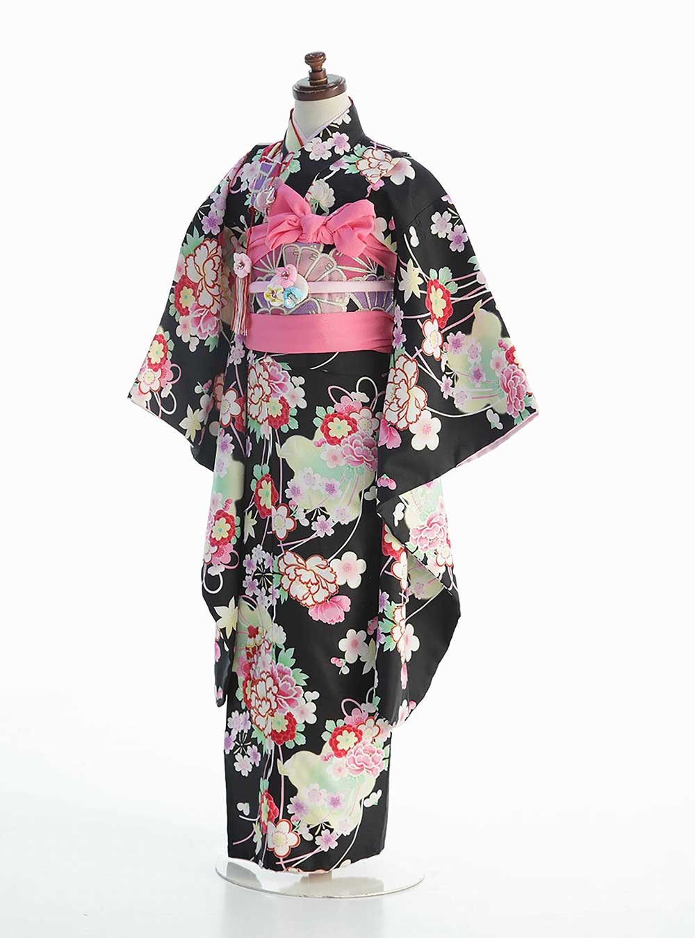 黒地に華やかな古典柄が描かれた古典着物。 牡丹や桜、流水といった伝統的な柄がお子様の健やかな成長を願う想いを表現しています。 牡丹の柄は、富貴や幸せ、美しさ、幸福、豊かさなどの意味合いを持ち、着物に用いられると縁起がよいとされ、人気の高い柄です。 黒色の着物は珍しく、古典ながらも大人っぽい印象にしてくれる着物です。