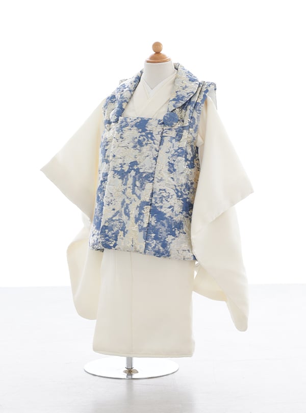 淡いアイボリーの着物に、青と白の絶妙なコントラストが美しい被布を合わせた一着。 まるで水彩画のような繊細な模様が施され、シンプルながらも存在感のある一着に仕上がっています。 伝統的な和装の魅力を活かしながら、モダンな雰囲気をプラスした特別な衣装。おしゃれで落ち着いた雰囲気を好む男の子にぴったりのコーディネートです♪