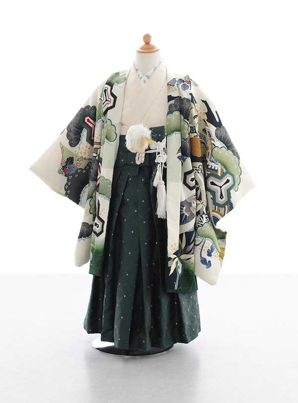 クリーム色地が淡い緑や大きな和柄が入っている着物。羽織の柄にはたくさんの雲や松・鳥が描かれています。中の着物はアイボリー1色なので、羽織の色味やデザインを際立てます。 ダークグリーンの袴は全体の色味を引き締め、落ち着いた印象に。緑が好きなお子さんが多いので、全体的に緑色が貴重となっているこの着物はとても人気です。